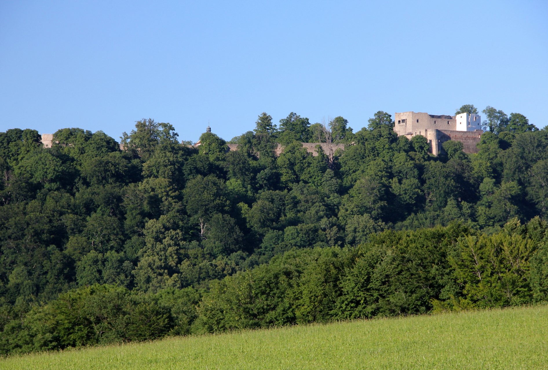Hrad Hukvaldy, v pozadí Kaple sv. Ondřeje
